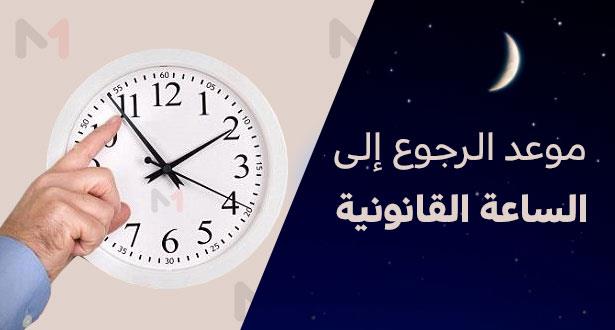 أعلنت وزارة إصلاح الإدارة والوظيفة العمومية أنه سيتم الرجوع إلى الساعة القانونية للمملكة (GMT)، وذلك بتأخير الساعة بستين دقيقة، عند حلول الساعة الثالثة صباحا من يوم الأحد 28 أكتوبر 2018.